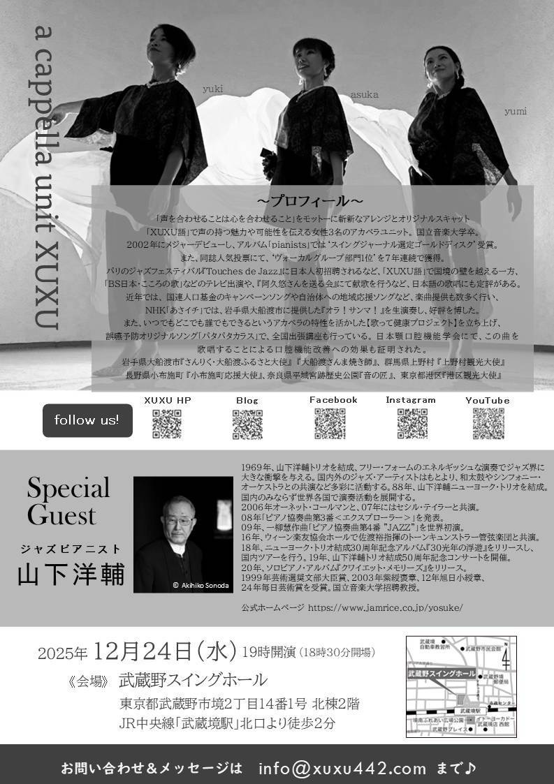 クラシックから民謡、ジャズ、歌謡曲まで幅広いジャンルをオリジナルスキャットXUXU語でパフォーマンスする3人の歌声、そして今年いっぱいで活動を休止なさる山下洋輔さんの演奏を間近でお聴きいただけるスペシャルステージです。